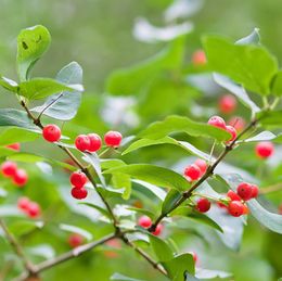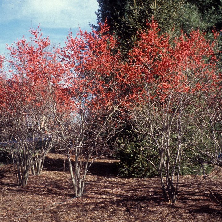 Native shrub; deciduous holly 6–10 ft. small green leaves; bright red berries (needs male pollinator). Blooms June (berries show fall–winter). Prefers full sun and moist to wet, acidic soil. Berries are eagerly consumed by robins and cat birds.